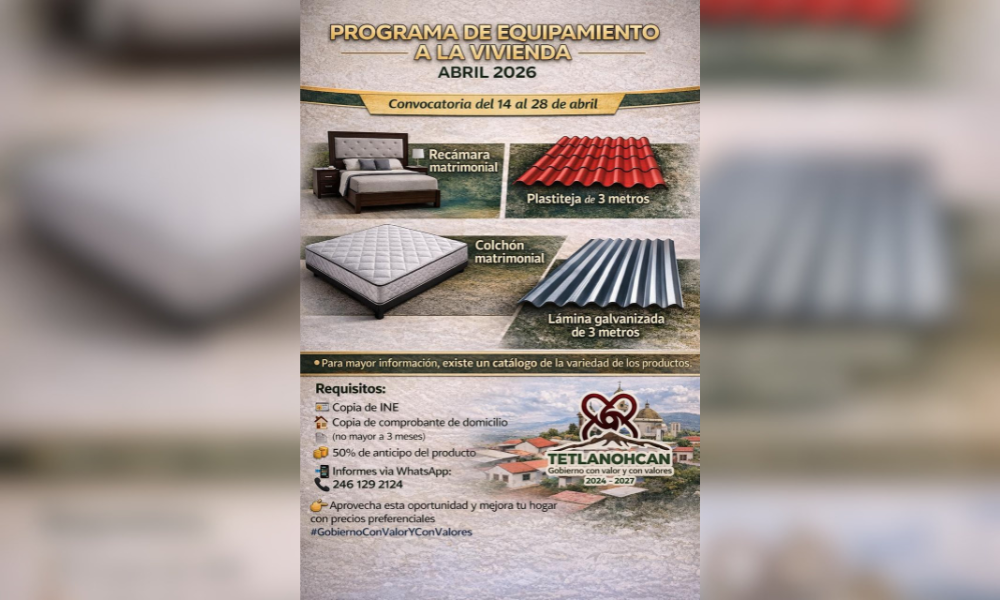 Con el objetivo de contribuir al bienestar de las familias del municipio, el Gobierno Municipal de Tetlanohcan, encabezado por la presidenta municipal Kritsbey Pérez Flores, puso en marcha el Programa de Equipamiento a la Vivienda correspondiente a abril de 2026, el cual ofrece productos a bajo costo para mejorar las condiciones del hogar.