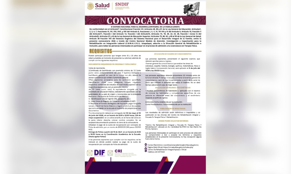 La convocatoria, emitida por el Sistema Nacional para el Desarrollo Integral de la Familia (SNDIF), está dirigida a personas de entre 18 y 35 años con certificado de bachillerato y promedio mínimo de 7.0. La entrega de fichas comenzó este 15 de abril y se realiza en la Coordinación Académica del CRI, de 8:00 a 16:00 horas, hasta agotar existencias.