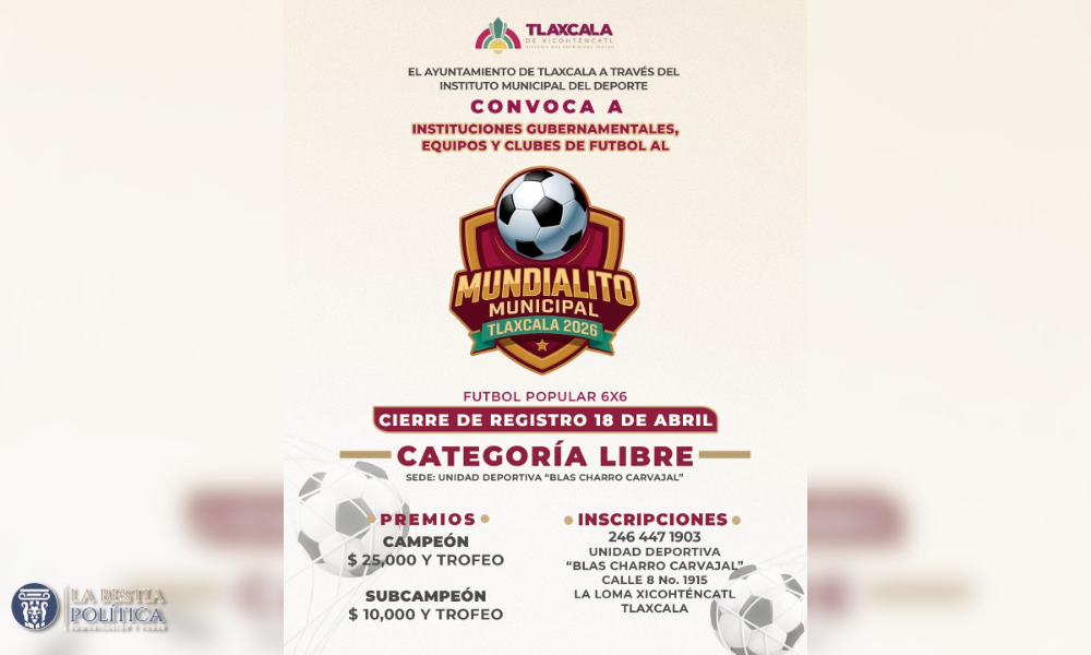 Este sábado 18 de abril concluye el periodo de inscripción para participar en el torneo de futbol popular 6×6 “Mundialito Municipal”, organizado por el Ayuntamiento de Tlaxcala para promover la actividad física, la convivencia social y la participación de jóvenes y ciudadanía en general.