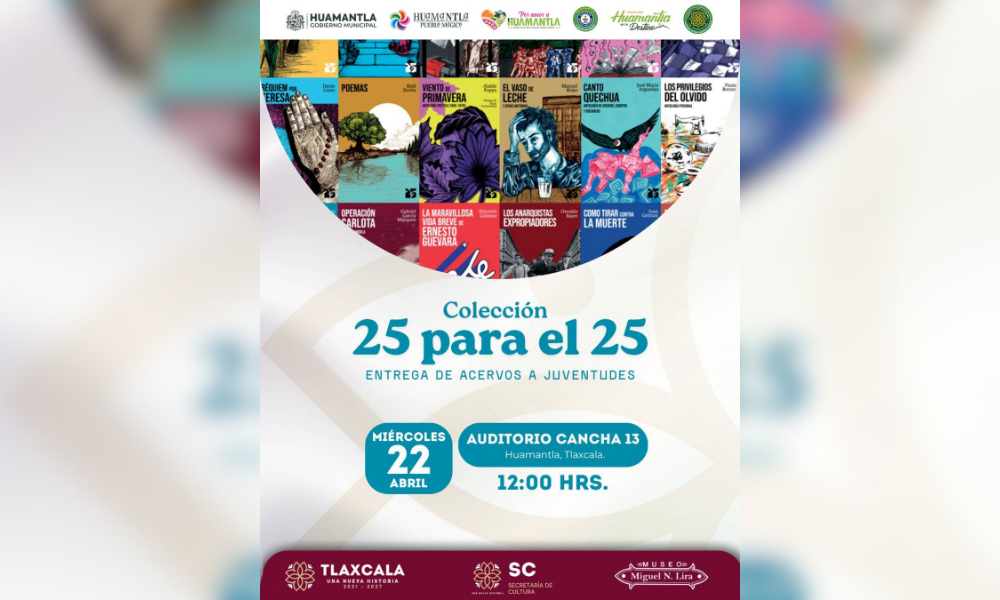 El Gobierno Municipal de Huamantla, a través de la Coordinación de Cultura, realizará este miércoles 22 de abril la entrega de acervos literarios “25 para el 25”, una iniciativa dirigida a juventudes del municipio con el propósito de fortalecer el pensamiento crítico y fomentar el hábito de la lectura.