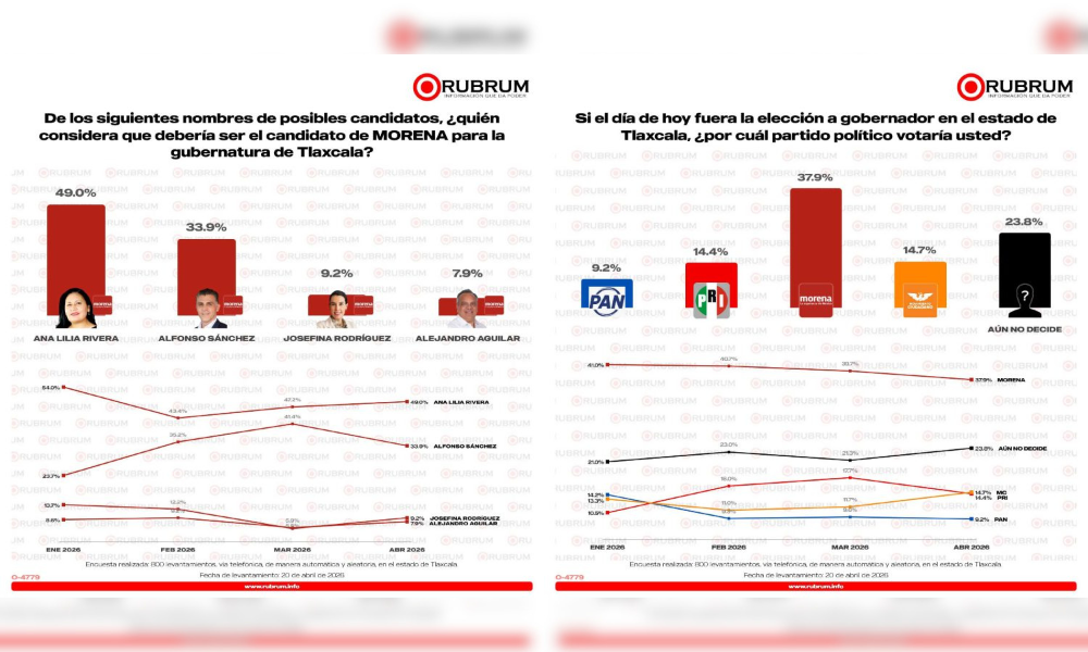 De realizarse hoy la elección para la gubernatura de Tlaxcala, la senadora Ana Lilia Rivera Rivera y el partido Morena obtendrían la victoria con una amplia ventaja, de acuerdo con una encuesta de Rubrum levantada el 20 de abril.