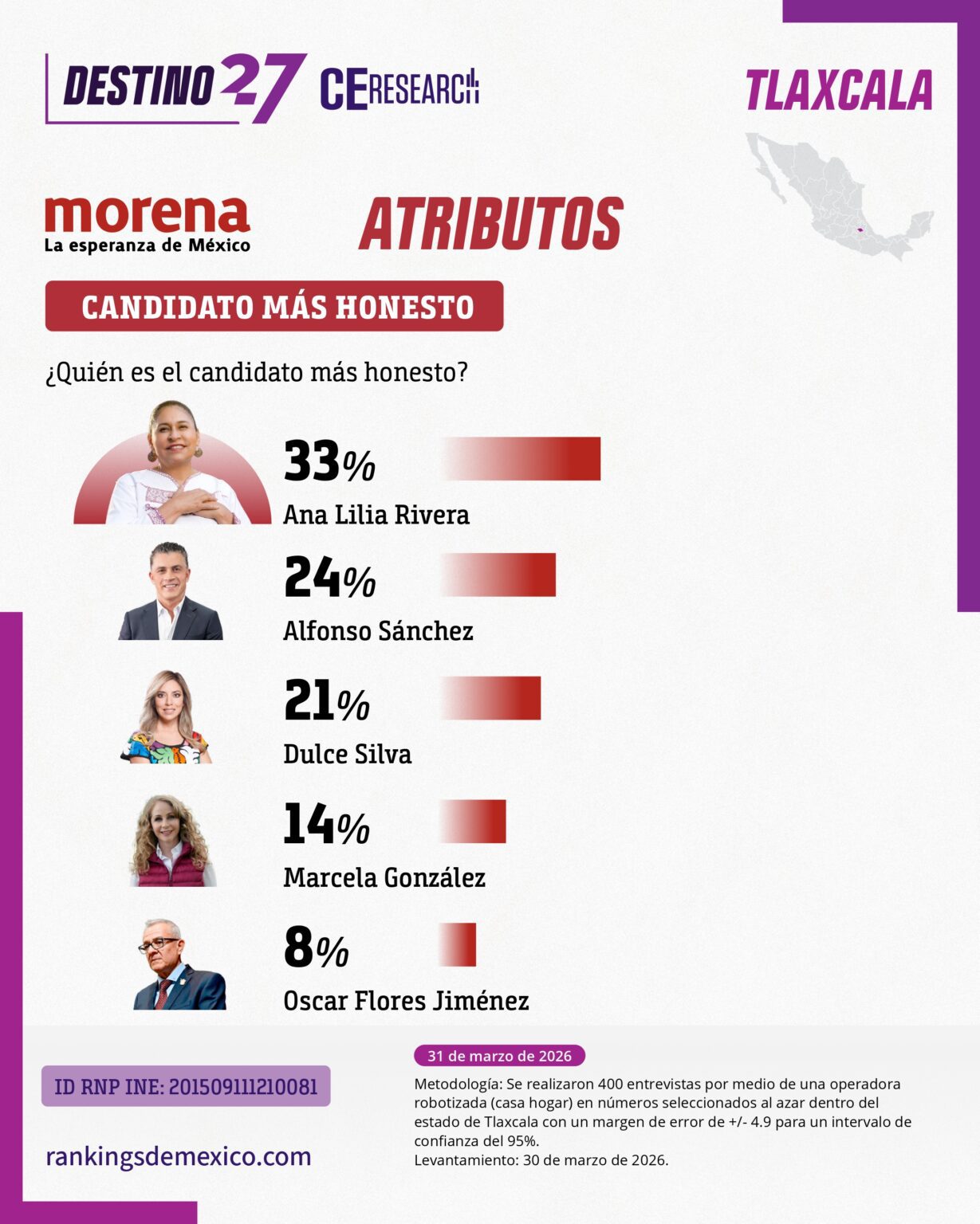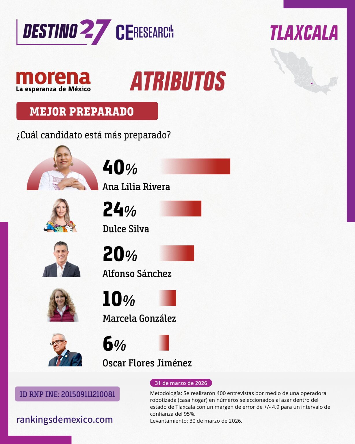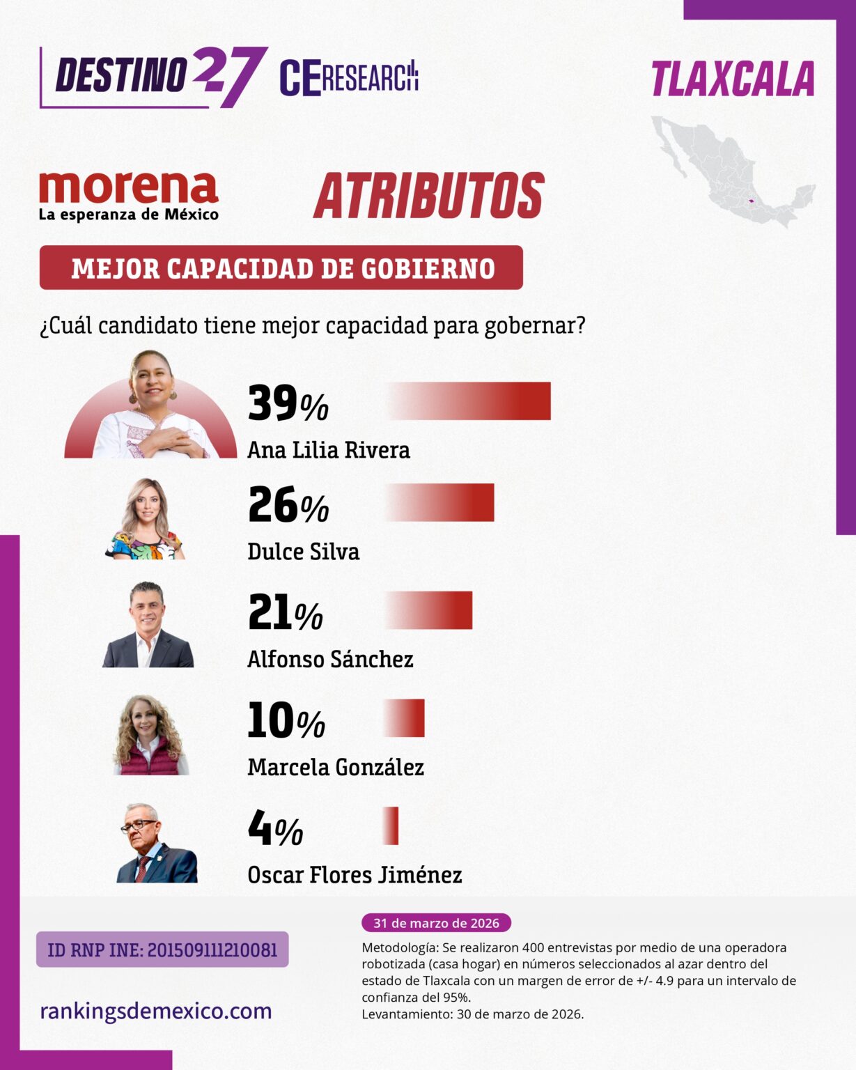 En el indicador de capacidad para gobernar, la ex legisladora también se ubicó en segundo lugar con 26 por ciento, nuevamente por encima de Alfonso Sánchez (21 por ciento), lo que refuerza su perfil como opción viable en términos de gestión pública.