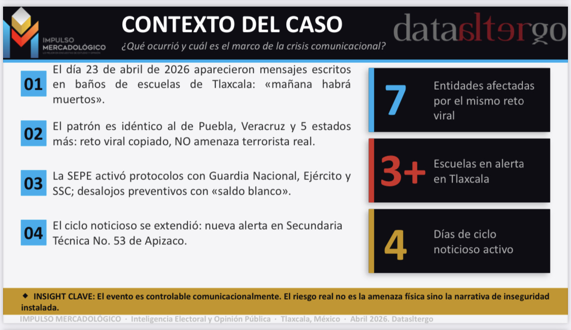 Mariana LOVERA// Un análisis de opinión pública realizado por Impulso mercadológico sobre Escucha Digital entre el 21 y 24 de abril de 2026, revela que las amenazas escolares que han generado pánico entre padres de familia en Tlaxcala no corresponden a un peligro terrorista real, sino a la réplica de un reto viral que ya ha afectado a al menos siete entidades del país, incluyendo Puebla y Veracruz.