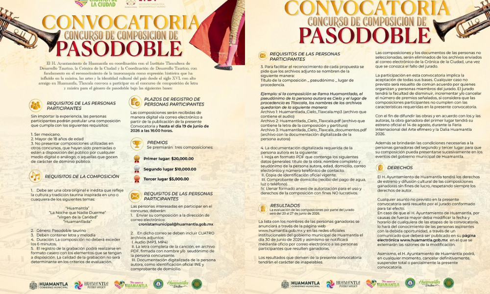 Con el objetivo de fortalecer y difundir una de las expresiones musicales más representativas de la tradición taurina, el Gobierno Municipal de Huamantla, en coordinación con el Instituto Tlaxcalteca de Desarrollo Taurino, la Crónica de la Ciudad y la Coordinación de Desarrollo Taurino, invita a la ciudadanía a participar en el Concurso de Composición de Pasodoble.