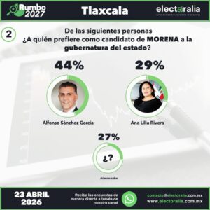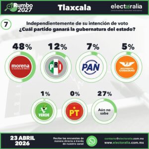 Finalmente, a nivel de percepción general –independientemente de quiénes sean los candidatos– el 48 por ciento de la población tlaxcalteca considera que Morena será el partido que obtendrá el triunfo en la próxima elección a la gubernatura, lo que refuerza el clima de favoritismo rumbo a los comicios.
