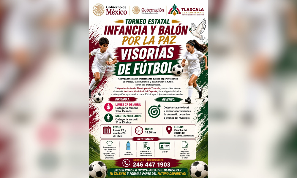 El Ayuntamiento de Tlaxcala, que preside Alfonso Sánchez García, a través de la Coordinación del Deporte, invita a niñas, niños y jóvenes a participar en el Torneo Estatal “Infancia y Balón por la Paz”, una iniciativa que promueve la sana convivencia, el desarrollo integral y la práctica deportiva como herramienta de transformación social.