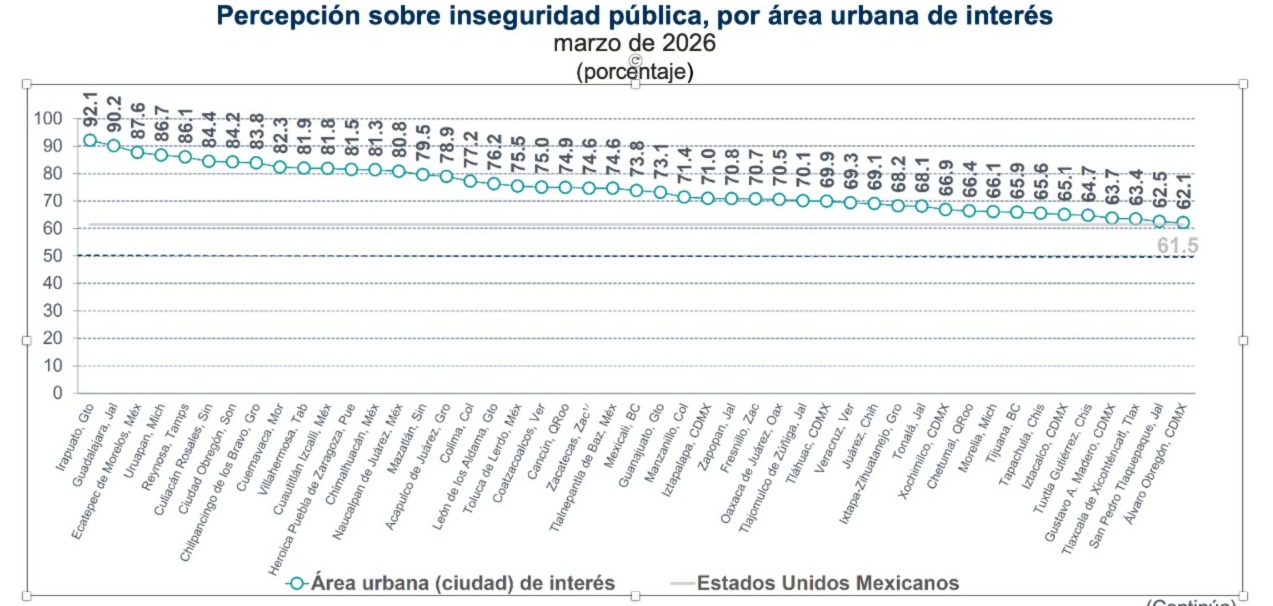 A nivel nacional, el 61.5% de la población en 91 áreas urbanas manifestó sentirse insegura en su ciudad. En contraste, Puebla se ubicó en la posición 12 con mayor percepción de inseguridad al alcanzar 81.5%, aunque también reportó una reducción de 3 puntos respecto al cierre de 2025.