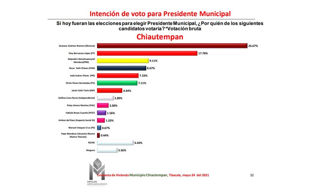 De acuerdo al estudio realizado por la empresa Impulso Mercadológico, si el día de hoy fueran las elecciones para presidente municipal, ante la pregunta ¿por cuál de los siguientes candidatos votaría?, Jiménez Romero se encuentra la cabeza de las preferencias electorales con un 26%, dejando en segundo lugar al candidato del PT, Eloy Berruecos.